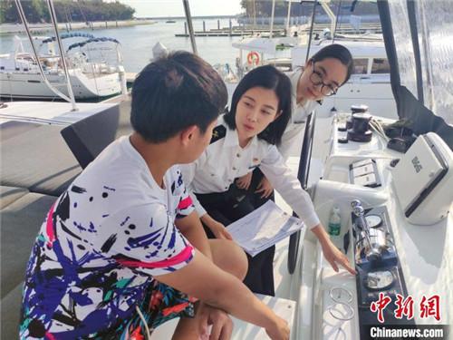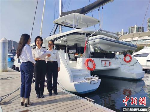 ??诤jP(guān)所屬三亞海關(guān)關(guān)員在清水灣游艇會碼頭實(shí)地查看帆船情況 王純豪 攝